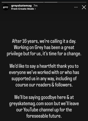 London, UK based skateboard magazine founded by photographer Henry Kingsford. In February 2026, Grey decided to cease operations (see the instagram story post in photos).